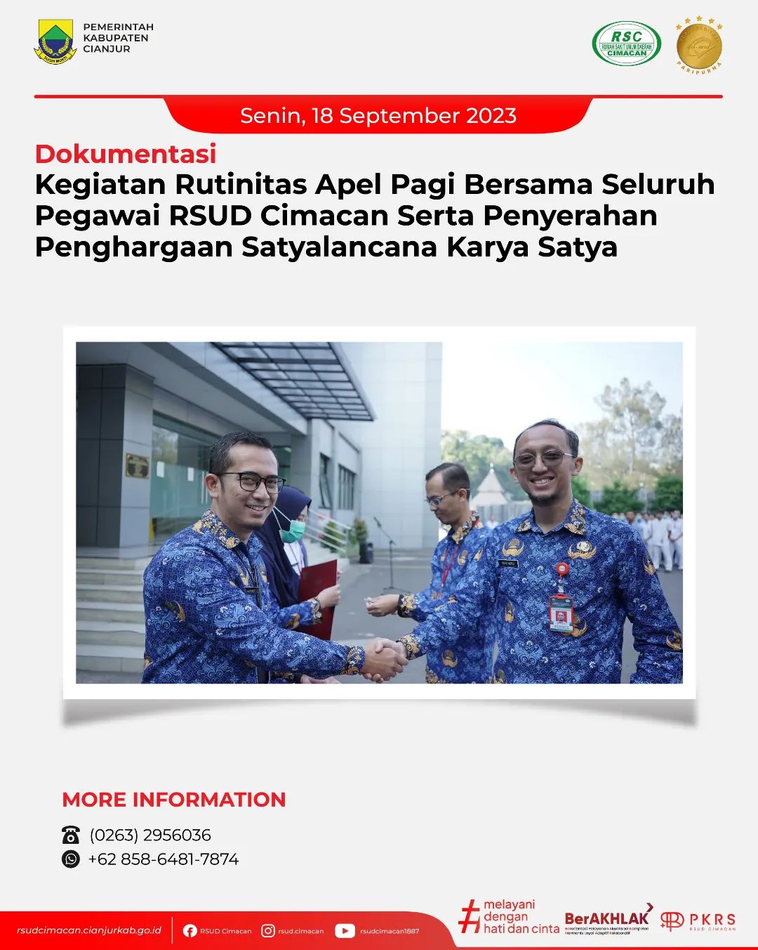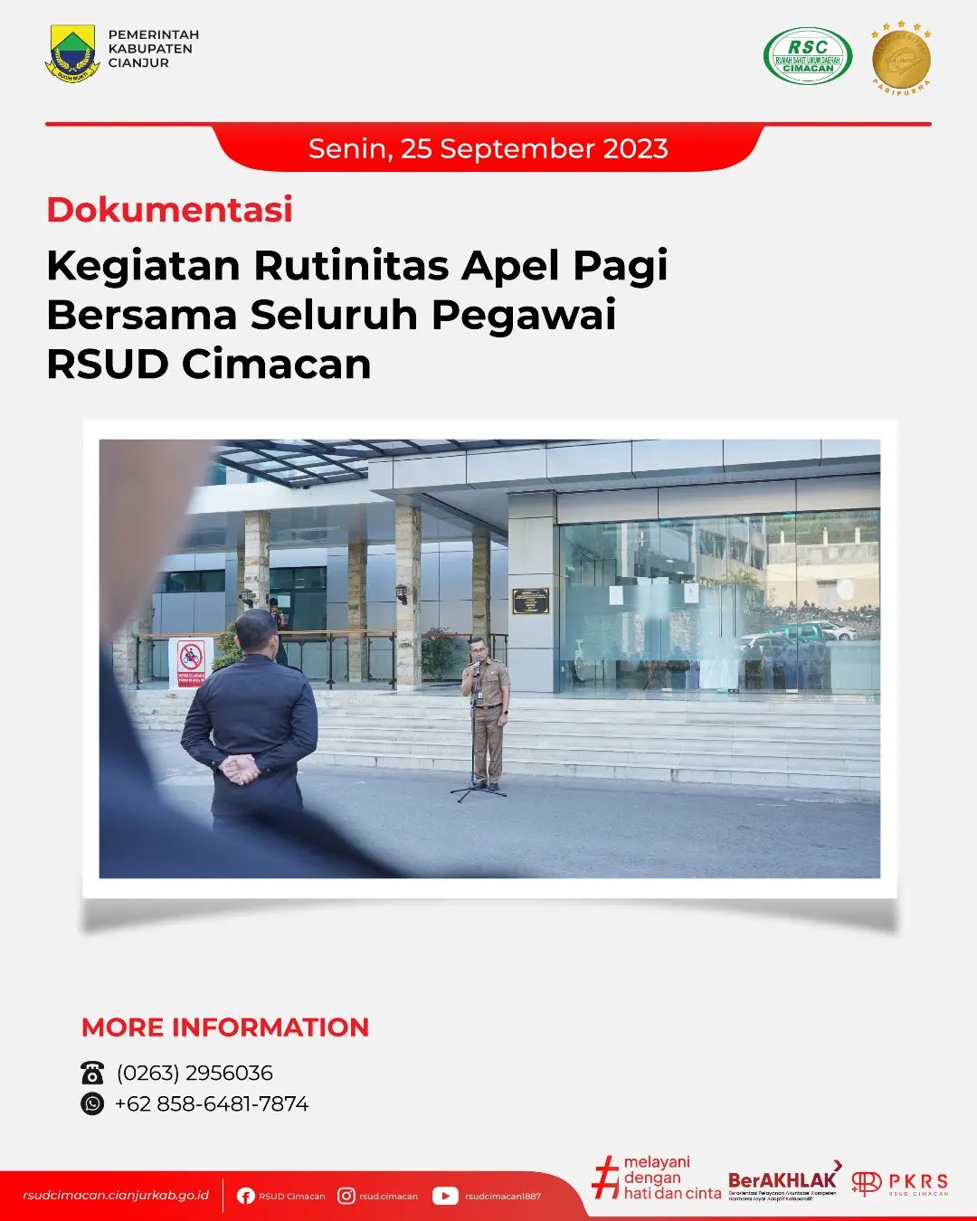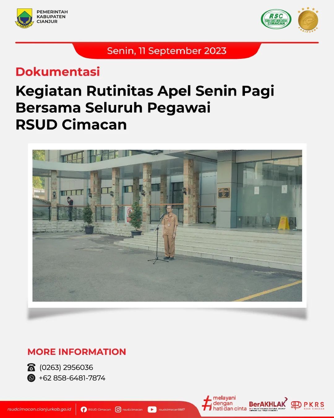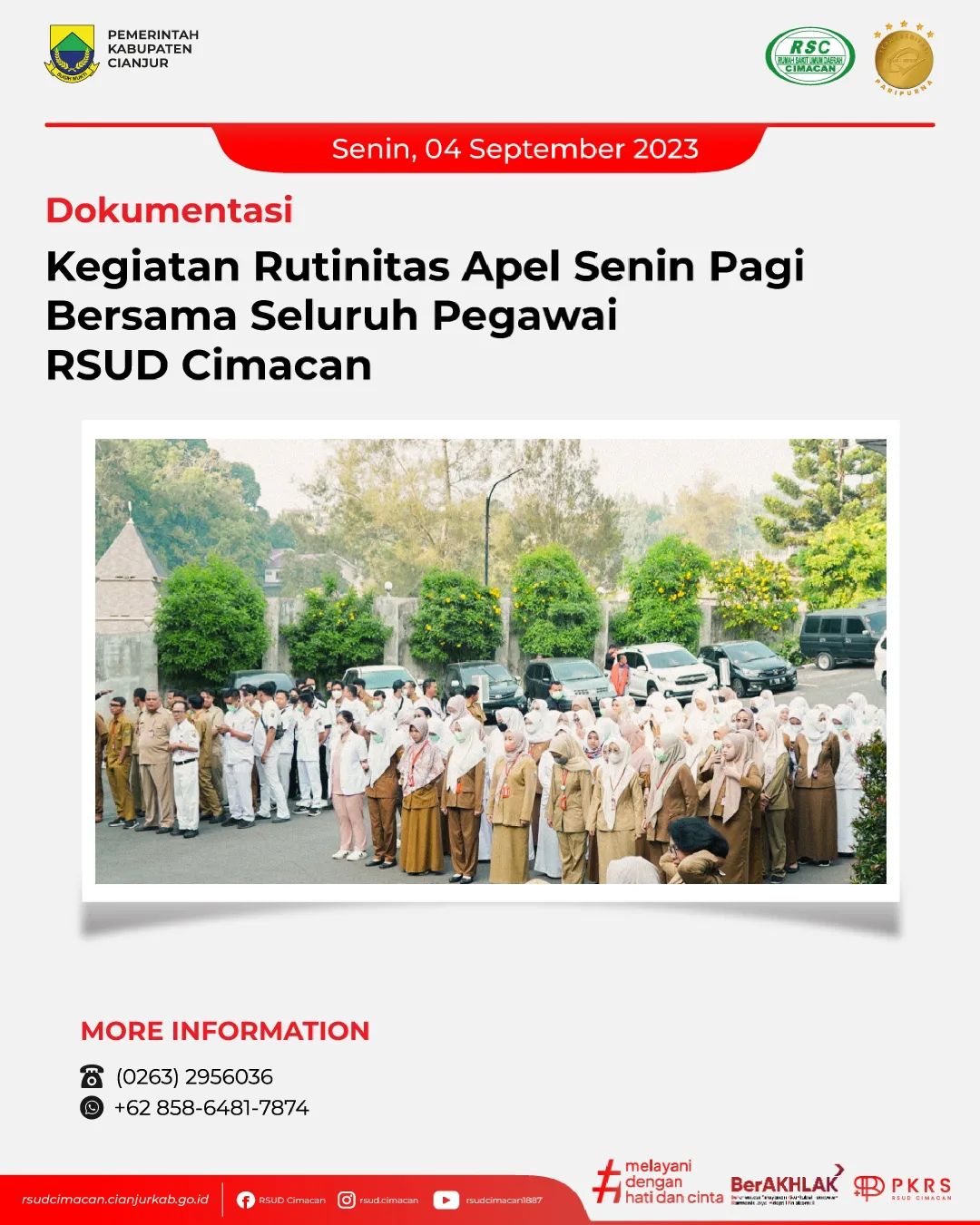 Senin, 04 September 2023 Kegiatan Apel Pagi di lingkungan RSUD Cimacan.