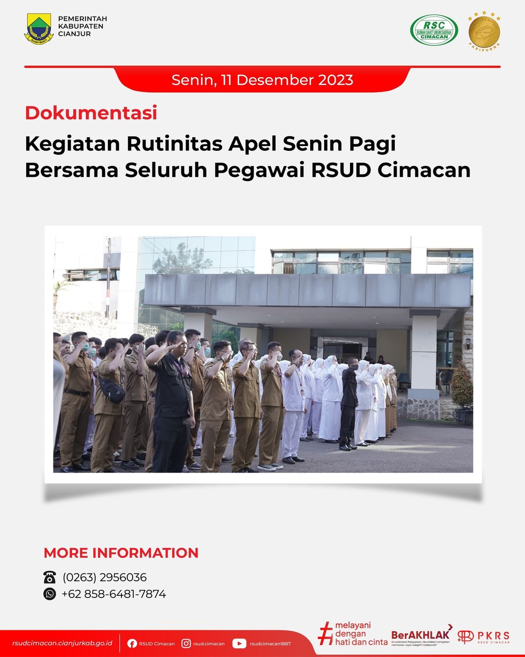 Senin, 11 Desember 2023 Kegiatan Apel Pagi di RSUD Cimacan Kegiatan rutin Apel Pagi Senin bersama seluruh pegawai RS...